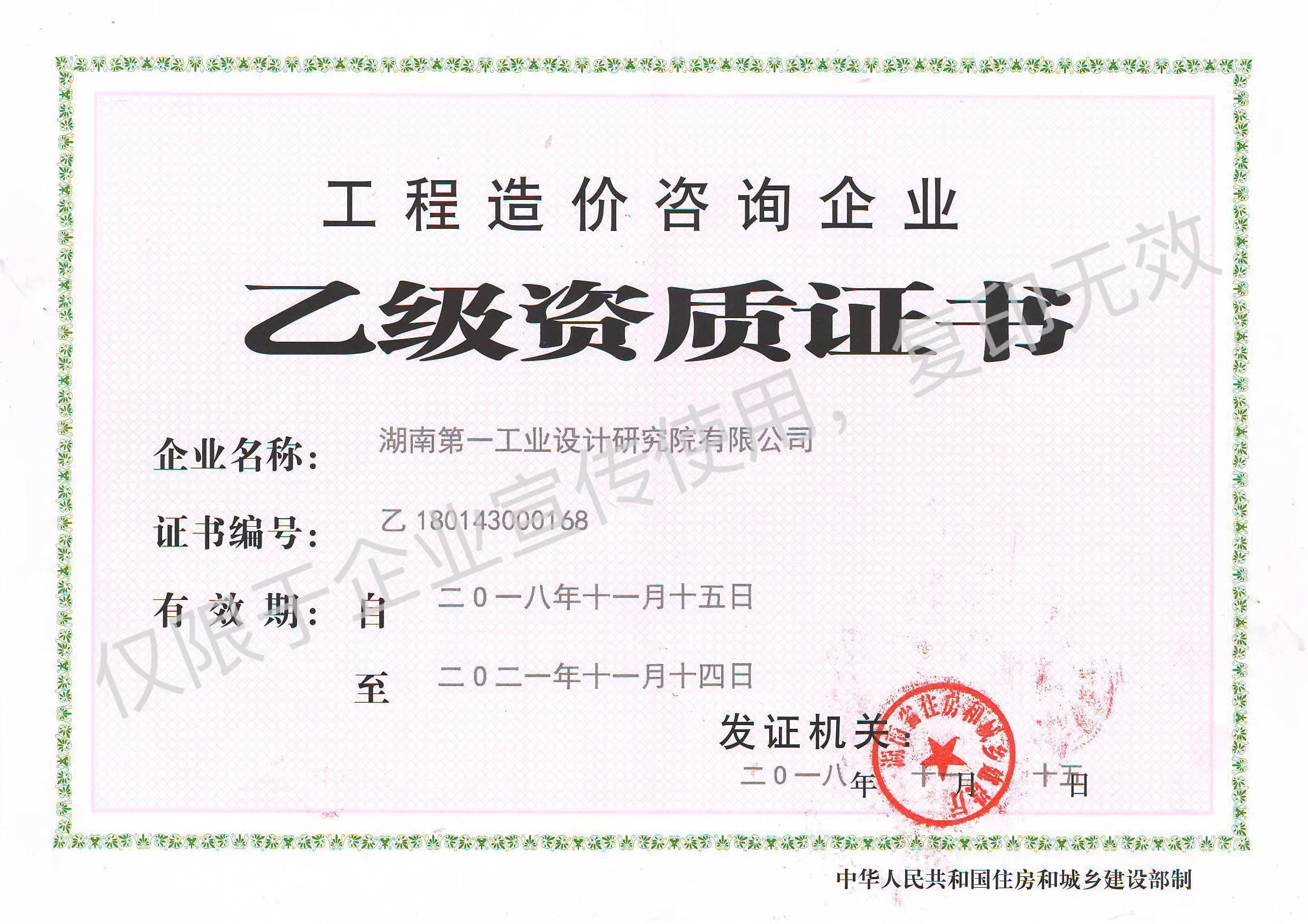 工程造價咨詢企業(yè)乙級資質(zhì)證書
